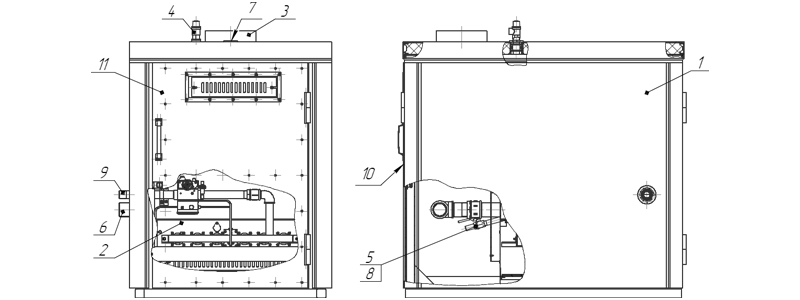 7. Подающий трубопровод 8. Слив 9. Патрубок присоединения к газопроводу 10. Задняя дверь 11. Передняя дверь . |
