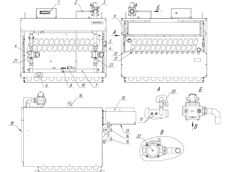 12. Теплообменник 13. Место отбора проб уходящих газов 14. Патрубки отопления (обратка) 15. Патрубки отопления (подача) 16. Транспортировочные проушины 17. Сливная пробка 18. Дверка 19. Глазок для контроля пламени 20. Предохранительный клапан 21. Штуцер для замера давления газа 22. Регулятор давления газа |
