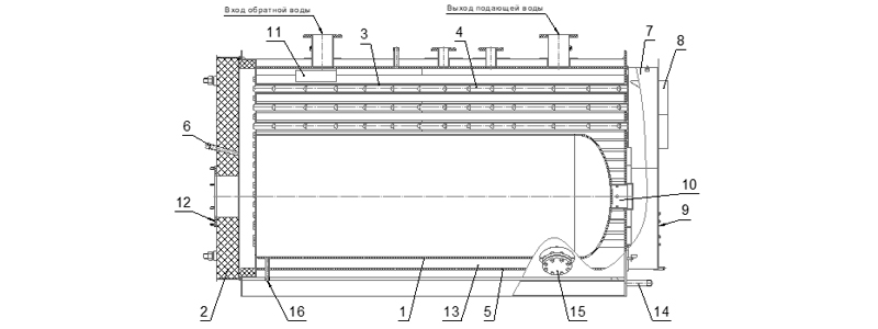 9. Люк очистки 10. Опора 11. Лоток 12. Фланец для крепления горелки 13. Теплоизоляция 14. Продувочный патрубок 15. Смотровой люк 16. Патрубок слива конденсата |